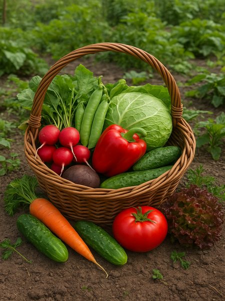 До набору входять: Редис Скарлет (10 г), Горох цукровий Колобок (10 г), Перець солодкий Подарунок Молдови (100 шт), Капуста білокачанна пізньостигла Мегатон F1 (20 шт), Буряк столовий Алексіс (10 г), Морква Королева осені (10 г), Томат колекційний Український гігант (30 шт), Огірок Засолочний (10 г), Салат листовий Лолло Россо (1 г).